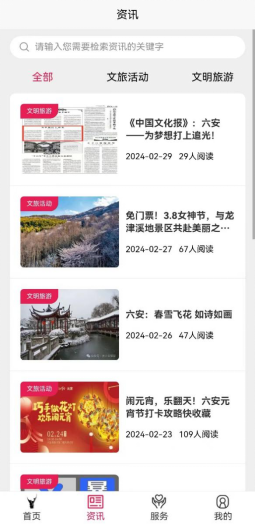 資訊頁面展示相關(guān)文旅活動和文明旅游等相關(guān)資訊,用戶點擊相關(guān)資訊可查看該資訊的詳細信息。