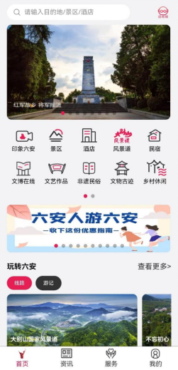 首頁展示輪播圖和功能服務(wù)按鈕區(qū)域,輪播圖展示熱門圖片和視頻,點擊相關(guān)功能按鈕,進入到對應(yīng)的資源展示界面,展示六安的熱門景點、人文古跡、特產(chǎn)美食、公共服務(wù)等資源。首頁推薦玩轉(zhuǎn)六安、發(fā)現(xiàn)六安等板塊。