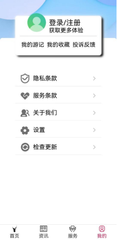 服務(wù)頁面主要為游客提供服務(wù)功能,包括游前準備、配套服務(wù)、意見反饋三個部分,全方位為游客提供相關(guān)游覽服務(wù)。