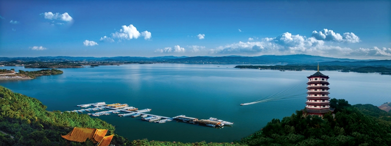 萬佛湖景區面積135平方公里,湖面50平方公里,庫容9.03億立方米。萬佛湖千米大壩,中夯粘土,外砌石塊護坡,橫空出世,氣勢磅礴,被原聯合國大壩委員會主席蘭希先生稱贊其為一項“非常了不起的工程”。