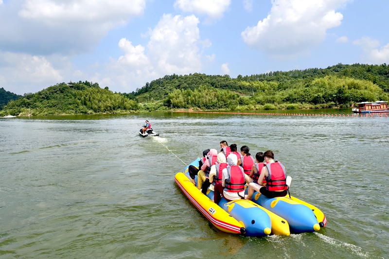 8月3日,游客在位于金安區橫塘崗鄉龍潭河水庫的六安歡樂水世界體驗水上香蕉船。