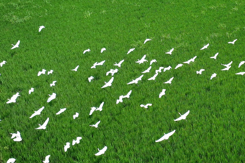 8月30日,在裕安區江家店鎮新溝民族村一處稻田里,成群的白鷺在農田里飛翔、覓食、嬉戲,構成一幅靈動秀美的鄉村生態畫卷。