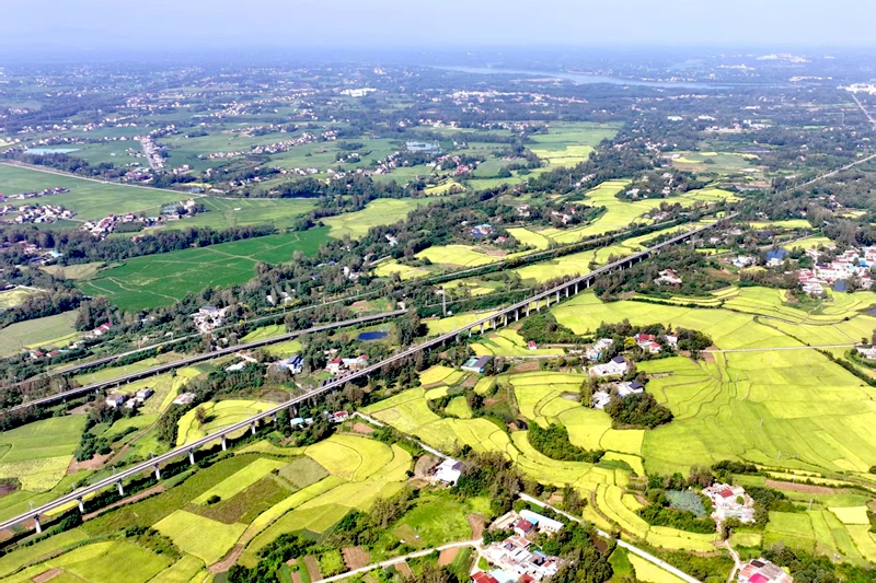 9月16日,裕安區(qū)城南鎮(zhèn)一處農(nóng)田里,次第成熟的水稻宛若為大地鋪上一層金毯。從空中俯瞰,滿目斑斕、生機(jī)盎然,與民居、鐵路等交相輝映,“豐”景如畫。