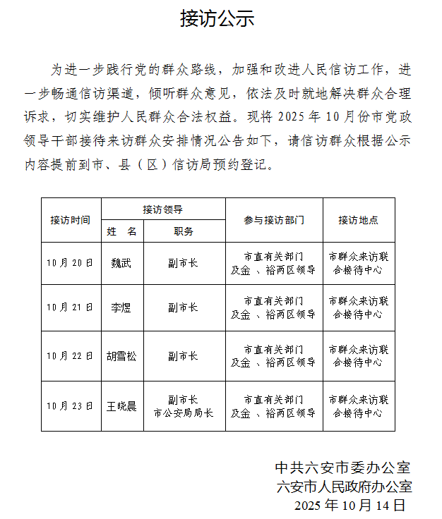 2025年10月份市黨政領(lǐng)導(dǎo)干部接待來訪群眾安排情況公告