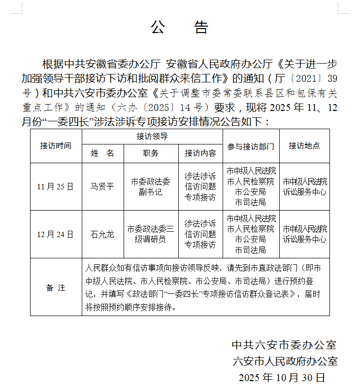 2025年11、12月份“一委四長”涉法涉訴專項接訪安排情況公告