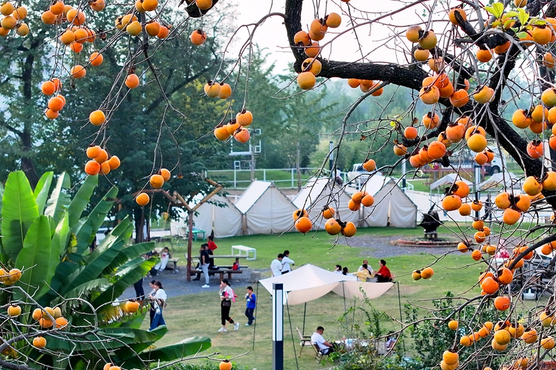 金秋時節,金安區城北鎮美上心田藝術家村幾株柿子樹上掛滿紅彤彤的柿子,十分誘人,扮靚農家,宛如油畫,成為鄉村一道靚麗的風景線,吸引市民和游客前去游玩觀賞。圖為10月4日,金安區城北鎮美上心田藝術家村成熟的柿子掛滿枝頭,與游人、休閑營地帳篷、傳統村落等相映成景。