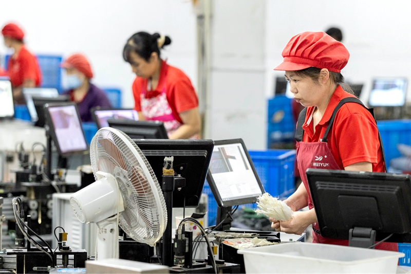 10月11日,在裕安區新安鎮的宇翔體育用品有限公司生產車間內,工人們正在生產線上緊張忙碌著。