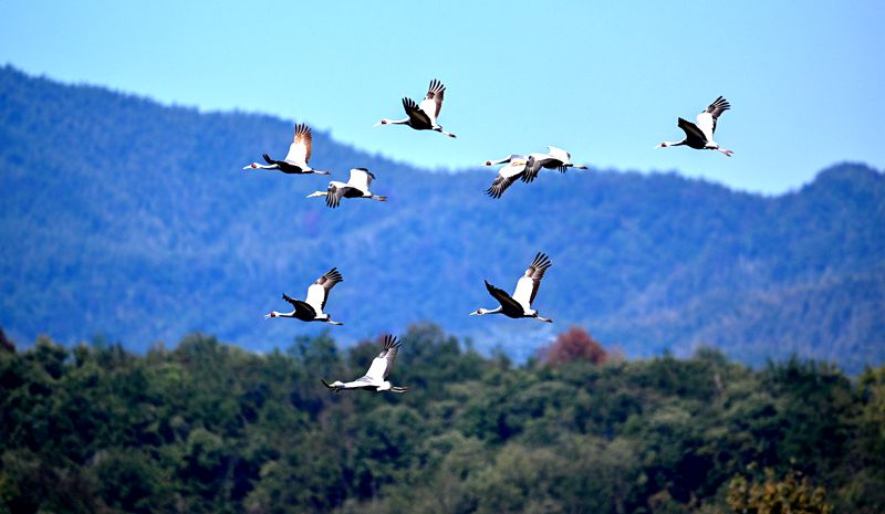 霍山東淠河濕地迎來今秋首批白枕鶴