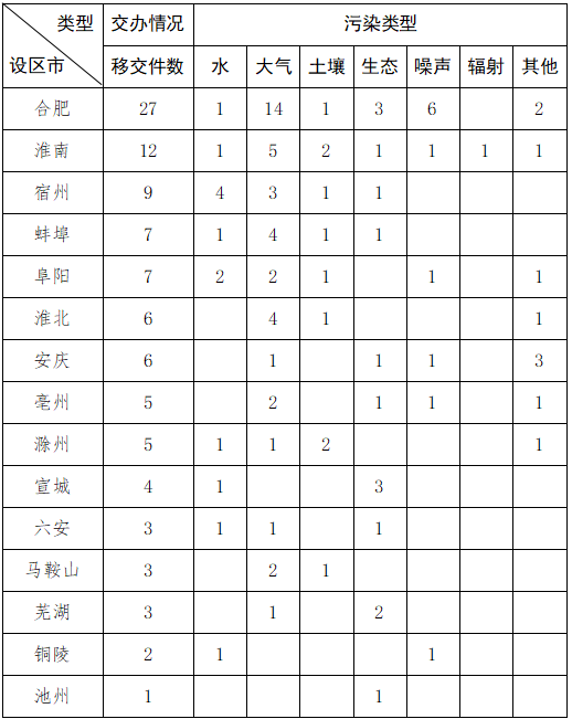 截至11月3日9時(shí),我省收到中央第二生態(tài)環(huán)境保護(hù)督察組轉(zhuǎn)辦的第十四批群眾信訪舉報(bào)件100件,涉及環(huán)境問題100個(gè)。其中,大氣環(huán)境問題40個(gè)、生態(tài)問題15個(gè)、水環(huán)境問題13個(gè)、噪聲問題11個(gè)、土壤問題10個(gè)、其他污染問題10個(gè)、輻射問題1個(gè)。第十四批轉(zhuǎn)辦信訪件涉及15個(gè)地市,分別是:合肥市(27件)、淮南市(12件)、宿州市(9件)、阜陽市(7件)、蚌埠市(7件)、淮北市(6件)、安慶市(6件)、亳州市(5件)、滁州市(5件)、宣城市(4件)、馬鞍山市(3件)、蕪湖市(3件)、六安市(3件)、銅陵市(2件)、池州市(1件)。
