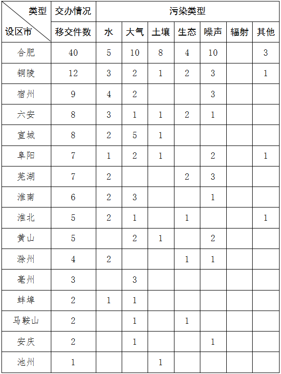 截至11月6日9時,我省收到中央第二生態環境保護督察組轉辦的第十七批群眾信訪舉報件121件,涉及環境問題121個。其中,大氣環境問題34個、水環境問題27個、噪聲問題27個、土壤問題14個、生態問題13個、其他污染問題6個。第十七批轉辦信訪件涉及16個地市,分別是:合肥市(40件)、銅陵市(12件)、宿州市(9件)、六安市(8件)、宣城市(8件)、阜陽市(7件)、蕪湖市(7件)、淮南市(6件)、淮北市(5件)、黃山市(5件)、滁州市(4件)、亳州市(3件)、蚌埠市(2件)、馬鞍山市(2件)、安慶市(2件)、池州市(1件)。
