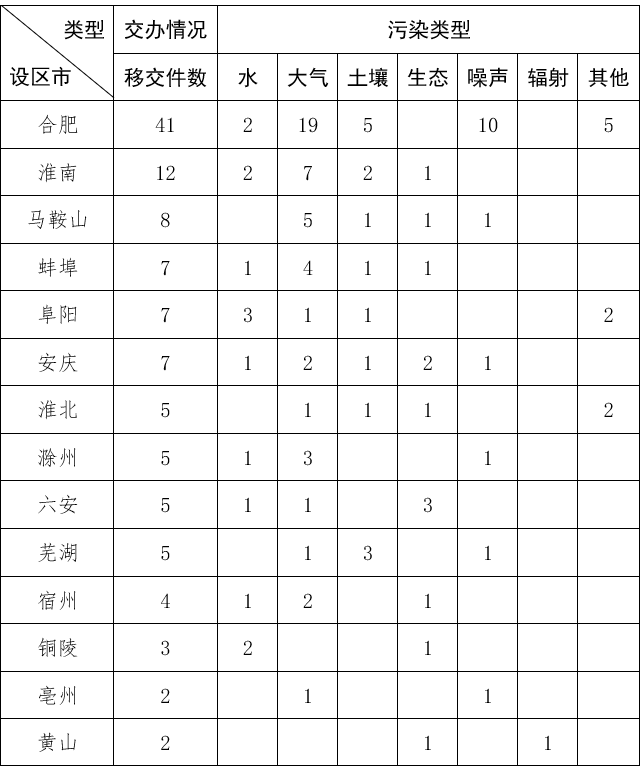 截至11月8日9時,我省收到中央第二生態環境保護督察組轉辦的第十九批群眾信訪舉報件113件,涉及環境問題113個。其中,大氣環境問題47個、噪聲問題15個、土壤問題15個、水環境問題14個、生態問題12個、其他污染問題9個、輻射問題1個。第十九批轉辦信訪件涉及14個地市,分別是:合肥市(41件)、淮南市(12件)、馬鞍山市(8件)、蚌埠市(7件)、阜陽市(7件)、安慶市(7件)、淮北市(5件)、滁州市(5件)、六安市(5件)、蕪湖市(5件)、宿州市(4件)、銅陵市(3件)、亳州市(2件)、黃山市(2件)。