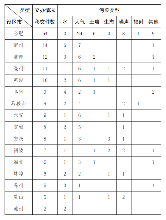 截至11月20日9時,我省收到中央第二生態環境保護督察組轉辦的第三十一批群眾信訪舉報件175件,涉及環境問題175個。其中,大氣環境問題76個、水環境問題34個、噪聲問題20個、其他污染問題17個、土壤問題13個、生態問題13個、輻射問題2個。第三十一批轉辦信訪件涉及16個地市,分別是:合肥市(54件)、宿州市(14件)、淮南市(12件)、亳州市(11件)、蕪湖市(10件)、阜陽市(9件)、六安市(9件)、馬鞍山市(9件)、安慶市(8件)、宣城市(8件)、銅陵市(7件)、淮北市(6件)、蚌埠市(6件)、滁州市(5件)、黃山市(5件)、池州市(2件)。